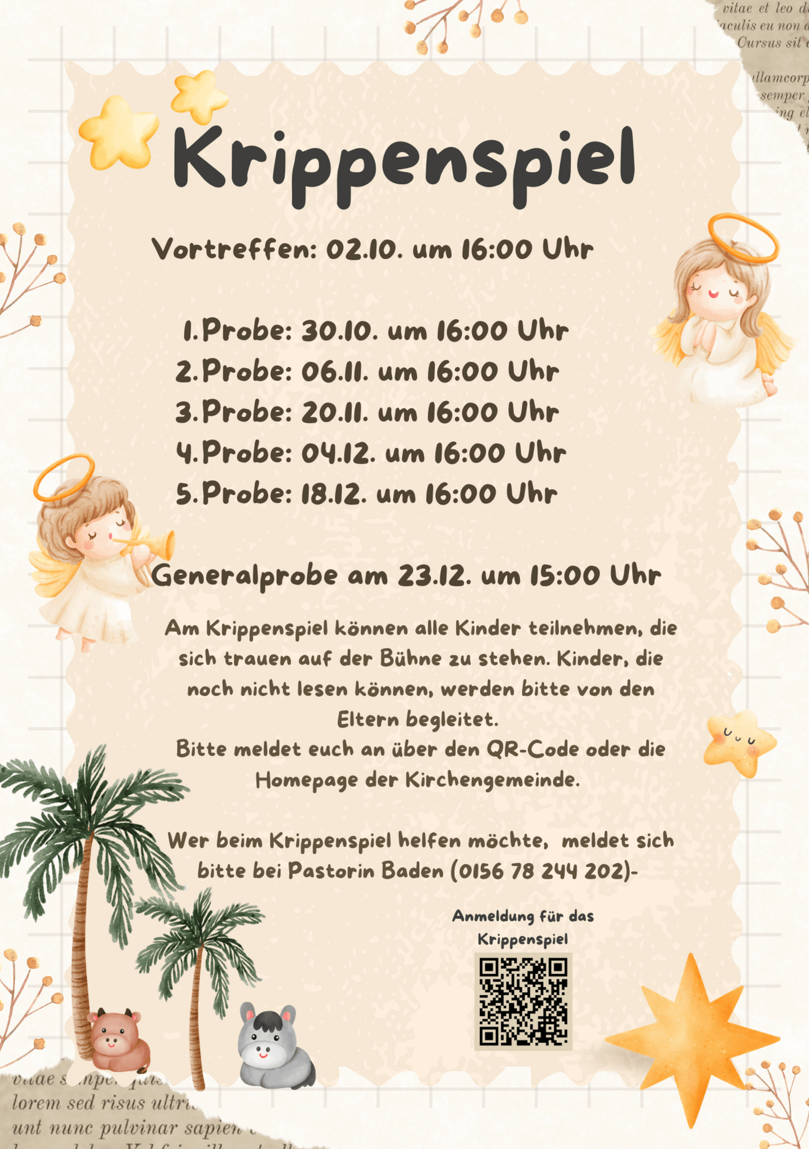 Bitte meldet euch an, wenn ihr beim Krippenspiel an Heiligabend mitmachen wollt. Gebt gerne schon einmal an, ob ihr einen bestimmten Rollenwunsch habt oder wie viel Text ihr auswendig lernen wollt. Die Termine für die Proben sind bereits geplant, an denen solltet ihr möglichst immer teilnehmen.